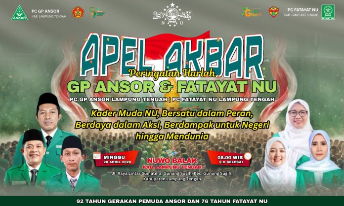 LAMPUNG TENGAH – Bertempat di komplek rumah dinas Bupati Lampung Tengah Nuwo Balak jajaran pengurus Pimpinan Cabang (PC) Gerakan Pemuda Ansor (GP Ansor) Kabupaten Lampung Tengah bersama pengurus Pimpinan Cabang (PC) Fatayat NU Lampung Tengah akan mengadakan apel akbar bersama pada Ahad (26/4/2026) pagi.