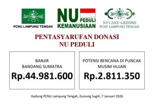 LAMPUNG TENGAH — Jajaran pengurus NU CARE Lembaga Amil Zakat, Infak, dan Shadaqah Nahdlatul Ulama (LAZISNU) PCNU Lampung Tengah, berhasil menghimpun dana kemanusiaan sebesar Rp.44.981.600,- untuk membantu korban banjir bandang di Sumatera, terutama di Provinsi Aceh, Sumatera Utara, dan Sumatera Barat, serta Rp.2.811.350,- yang dialokasikan sebagai dana darurat potensi bencana di puncak musim hujan.